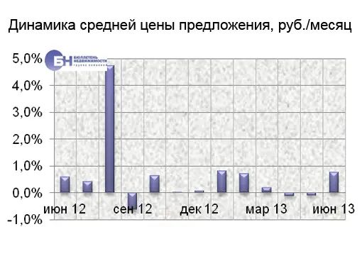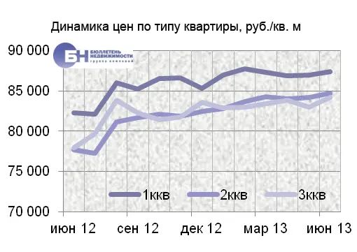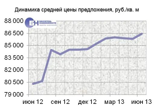 Доля объектов, цена квадратного метра которых меньше 60 тыс. руб. за кв. м, составляет на июнь 2013 года 7,8% от общего объема предложения квартир. Большую долю рынка занимают цены в диапазоне от 60 до 90 тыс. руб. за кв. м, это 59,4% от объема квартир, выставленных в июне на продажу. Доля дорогих объектов, цена которых превышает 90 тыс. руб. за кв. м, в июне 2013 года составляет 32,8% от всего предложения.