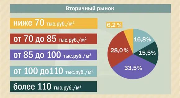 Доля объектов, цена которых меньше 70 тыс. руб. за кв. м, составляет 6,2% от общего объема предложения квартир. Большую долю рынка занимает диапазон цены от 70 до 100 тыс. руб. за кв. м, что составляет 61,6% от объема выставленных на продажу квартир. Диапазон цены квадратного метра от 100 до 110 тыс. руб. занимает 15,5%. Доля дорогих объектов, цена которых превышает 110 тыс. руб. за кв. м, это 16,8% от всего предложения.