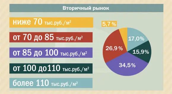 Доля объектов, цена которых меньше 70 тыс. руб. за кв. м, составляет 5,7% от общего объема предложения квартир. Большую долю рынка занимают цены диапазона от 70 до 100 тыс. руб. за кв. м, что составляет 61,5% от объема выставленных на продажу квартир. Диапазон стоимости квадратного метра от 100 до 110 тыс. руб. занимает 15,9%. Доля дорогих объектов, цена которых превышает 110 тыс. руб. за кв. м, – 17% от всего предложения.
