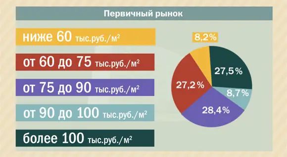 Доля объектов, цена которых меньше 60 тыс. руб. за кв. м, составляет 8,2% от общего объема предложения квартир. Большую долю рынка занимают цены диапазона от 60 до 90 тыс. руб. за кв. м, что составляет 55,6% от объема выставленных на продажу квартир. Диапазон стоимости квадратного метра от 90 до 100 тыс. руб. занимает 8,7%. Доля дорогих объектов, цена которых превышает 100 тыс. руб. за кв. м, в сумме – 27,5% от всего предложения.