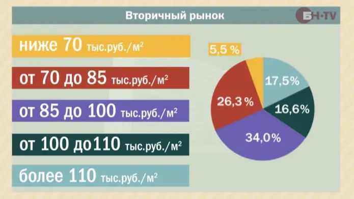 Доля объектов, цена которых меньше 70 тыс. руб. за кв. м, составляет 5,5% от общего объема предложения квартир. Большую долю рынка занимают цены диапазона от 70 до 100 тыс. руб. за кв. м, что составляет 60,4% от объема выставленных на продажу квартир. Диапазон стоимости квадратного метра от 100 до 110 тыс. руб. занимает 16,6%. Доля дорогих объектов, цена которых превышает 110 тыс. руб. за кв. м, – 17,5% от всего предложения.