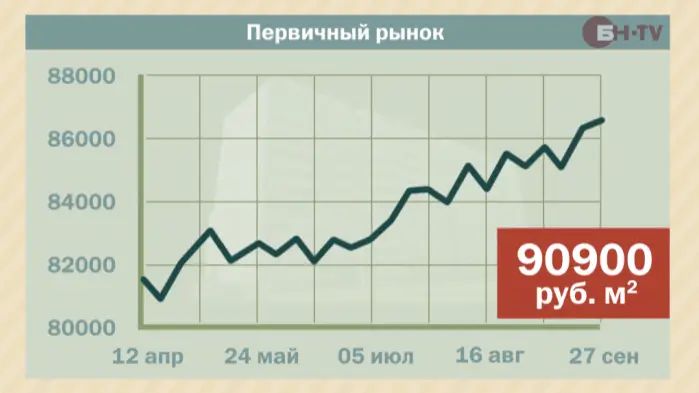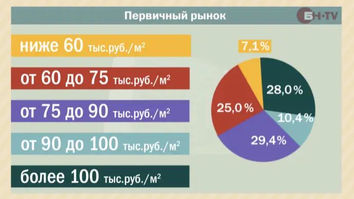 Доля объектов, цена которых меньше 60 тыс. руб. за кв. м, составляет 7,1% от общего объема предложения квартир. Большую долю рынка занимают цены диапазона от 60 до 90 тыс. руб. за кв. м, что составляет 54,4% от объема выставленных на продажу квартир. Диапазон стоимости квадратного метра от 90 до 100 тыс. руб. занимает 10,4%. Доля дорогих объектов, цена которых превышает 100 тыс. руб. за кв. м, в сумме – 28,1% от всего предложения.