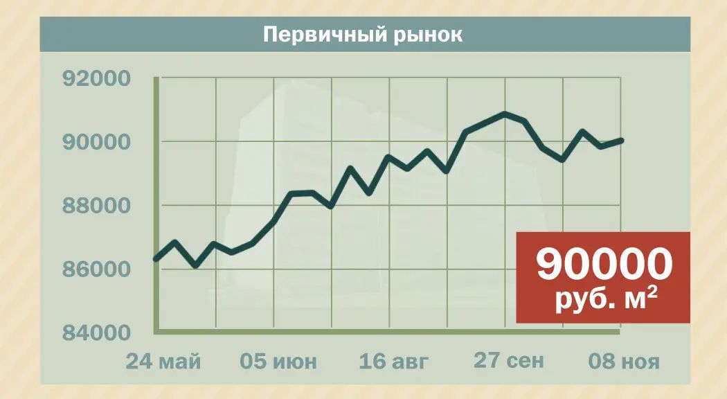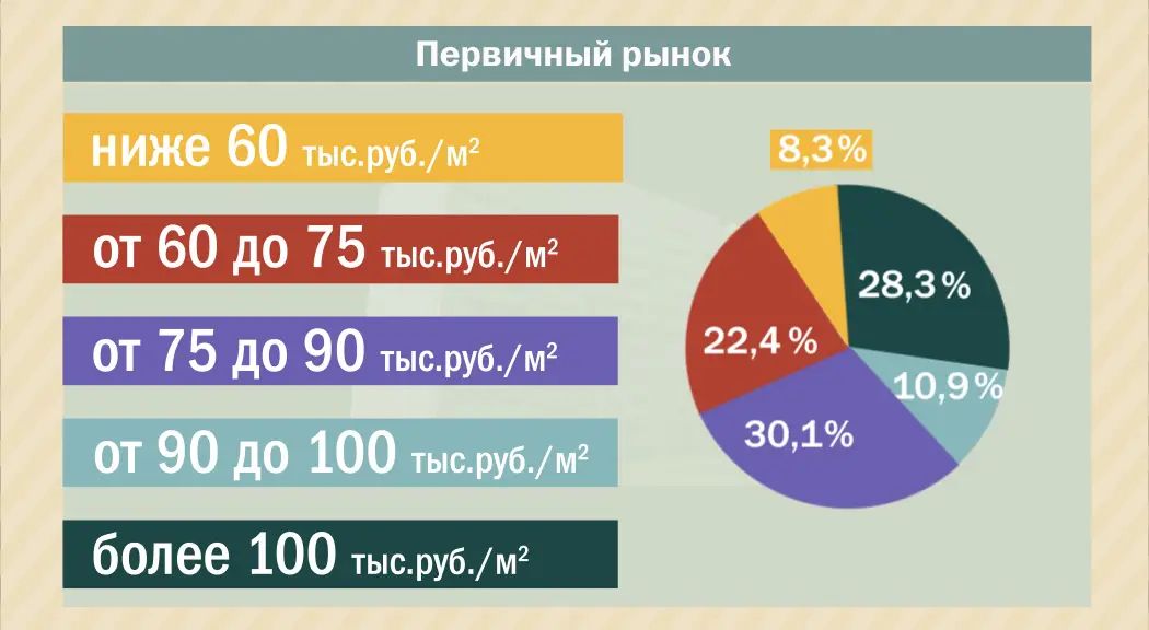 Доля объектов, цена которых меньше 60 тыс. руб. за кв. м, составляет 8,3% от общего объема предложения квартир. Большую долю рынка занимают цены в диапазоне от 60 до 90 тыс. руб. за кв. м, что составляет 52,5% от объема выставленных на продажу квартир. Диапазон стоимости квадратного метра от 90 до 100 тыс. руб. занимает 10,9%. Доля дорогих объектов, цена которых превышает 100 тыс. руб. за кв. м, в сумме – 28,3% от всего предложения.
