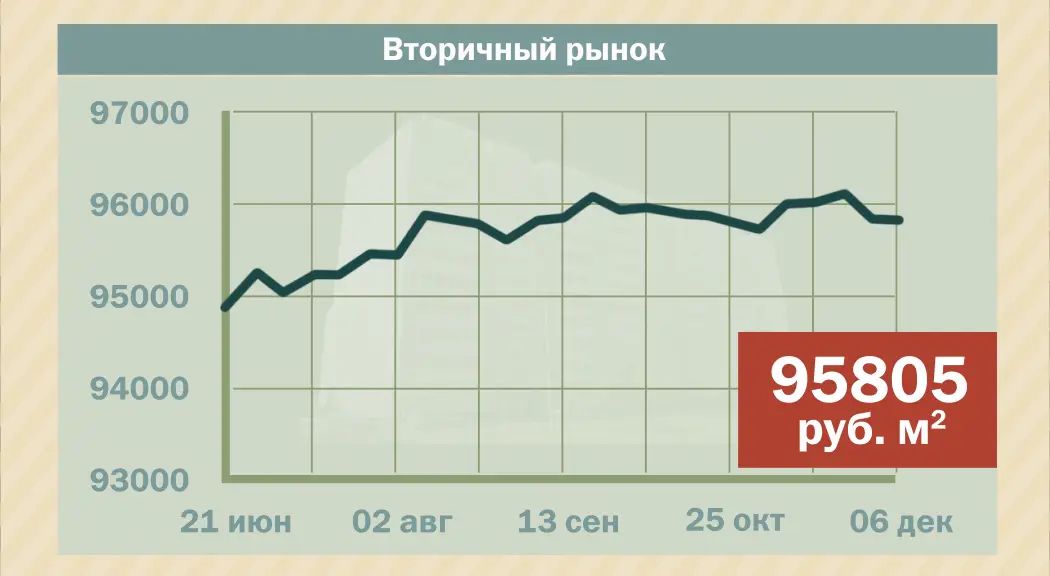 За минувшую неделю изменение средней цены предложения на вторичном рынке квартир в рублевом эквиваленте составило минус 0,04%, это 40,1 руб. с кв. м. Показатель средней цены предложения за неделю с 29 ноября по 06 декабря 2013 года составил 95,8 тыс. руб. за кв. м. Цена предложения в долларах – 2,9 тыс. за кв. м, в евро – 2,1 тыс.