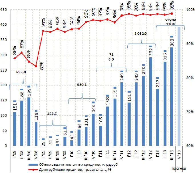 Наконец, тенденцией можно считать общий рост ипотечного рынка. Согласно усредненным прогнозам в целом за год будет выдано ипотечных кредитов на 1,3 трлн руб. (см. таблицу). Если в 2012 году физическими лицами с привлечением жилищного кредита было заключено 20,5% сделок на отечественном рынке недвижимости, то в 2013-м уже 24,6%.