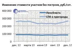 Стоимость сотки земли на конец 2013 года по области составила 83,5 тыс. руб. (в среднем это 1,1 млн руб. за участок), по Петербургу и пригородным районам – 264 тыс. руб. (в целом за участок 3,5 млн руб.).