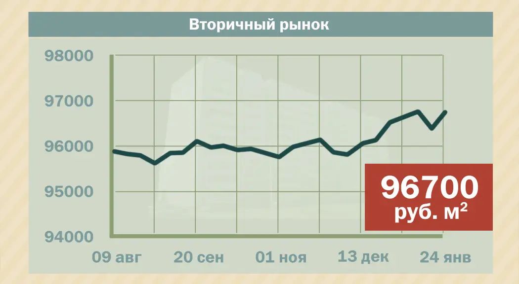 За минувший период средняя цена предложения на вторичном рынке не изменилась. Показатель средней цены предложения за неделю с 24 января по 31 января 2014 года составил 96,7 тыс. руб. за кв. м. Цена предложения в долларах – 2,7 тыс. за кв. м, в евро – 2 тыс.