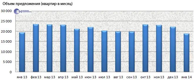 Общий объем предложения в нынешнем январе (18,7 тысячи квартир) оказался чуть меньше, чем в январе 2013 года. При этом прошлой зимой продавцы также предпочитали выжидать: именно в феврале было отмечено «взрывное» увеличение количества выставленных на продажу квартир сразу на 20%, с 19,3 до 23,4 тысячи объектов.