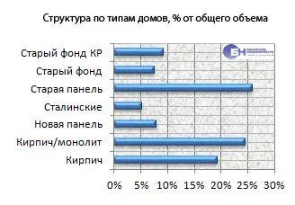 В структуре предложения вторичного рынка квартир преобладают квартиры в домах категории «старая панель» (хрущевки, брежневки и «корабли»), которых в общей сложности на рынке около 26%.