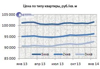 Средние цены предложения однокомнатных квартир на конец января 2014 года составили 3,8 млн руб., двухкомнатных – 5,5 млн руб., трехкомнатных – 7,6 млн руб.