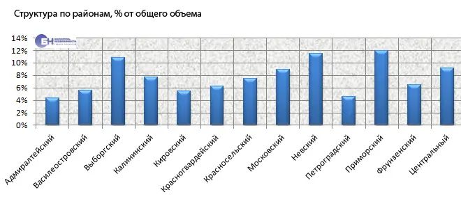 Структура предложения по районам долгие годы остается постоянной. Лидирующие позиции, как и раньше, занимает Приморский район, на который приходится 12% выставленных на продажу квартир. Не сильно отстают Выборгский и Невский районы, их доли составляют 10,8% и 11,5%.