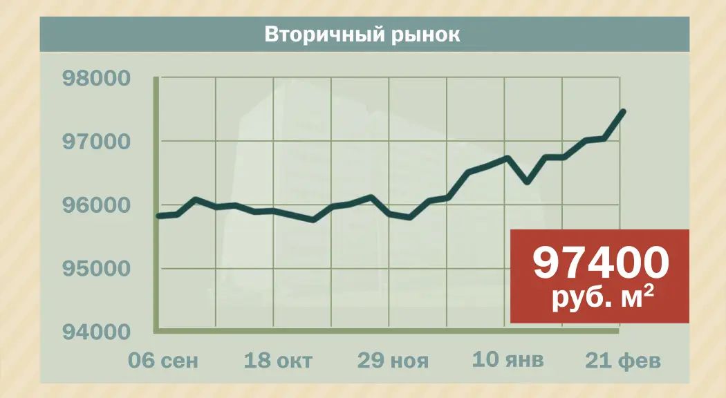 За минувший период изменение средней цены предложения на вторичном рынке квартир в рублевом эквиваленте составило 0,4%, это 423,5 руб. с кв. м. Показатель средней цены предложения за неделю с 14 февраля по 21 февраля 2014 года составил 97,4 тыс. руб. за кв. м. Цена предложения в долларах – 2,7 тыс. за кв. м, в евро – 2 тыс.