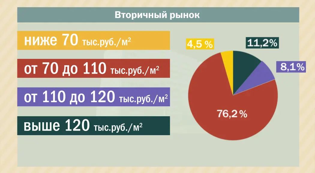 Доля объектов, цена которых меньше 70 тыс. руб. за кв. м, составляет 4,5% от общего объема предложения квартир. Большую долю рынка занимают цены диапазона от 70 до 110 тыс. руб. за кв. м, что составляет 76,2% от объема выставленных на продажу квартир. Диапазон стоимости квадратного метра от 110 до 120 тыс. руб. занимает 8,1%. Доля дорогих объектов, цена которых превышает 120 тыс. руб. за кв. м, – 11,2% от всего предложения.