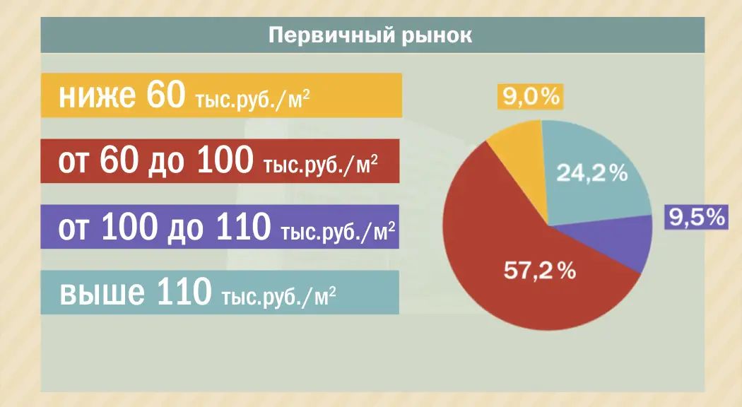 Доля объектов, цена которых меньше 60 тыс. руб. за кв. м, составляет 9% от общего объема предложения квартир. Большую долю рынка занимают цены в диапазоне от 60 до 100 тыс. руб. за кв. м, что составляет 57,2% от объема выставленных на продажу квартир. Диапазон стоимости квадратного метра от 100 до 110 тыс. руб. – 9,5%. Доля дорогих объектов, цена которых превышает 110 тыс. руб. за кв. м, в сумме – 24,2% от всего предложения.