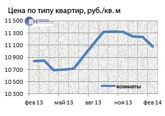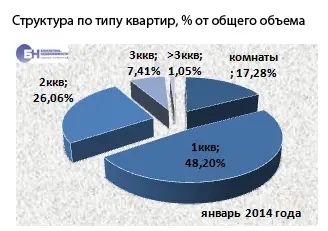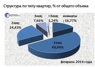 В структуре предложения на рынке аренды типового жилья в феврале 2014 года по-прежнему преобладают комнаты и однокомнатные квартиры, занимая соответственно 32,2 и 41% рынка. Двухкомнатные составляют 20,2%, доля трехкомнатных не превышает 6%. Многокомнатные (четыре комнаты и более) составляют 0,7% от общего объема типовых квартир, предлагаемых в аренду.