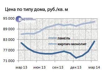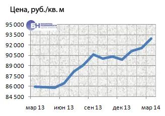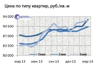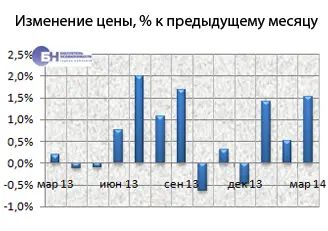 В среднем по рынку строящегося жилья за прошедший месяц процент изменения цены предложения на однокомнатные квартиры составил 2,7%, на двухкомнатные – 0,9%. Трехкомнатные подорожали на 0,6%. Средние цены предложения в марте 2014 года для однокомнатных квартир – 3,6 млн руб., двухкомнатных – 5,8 млн руб., трехкомнатных – 8,8 млн руб.