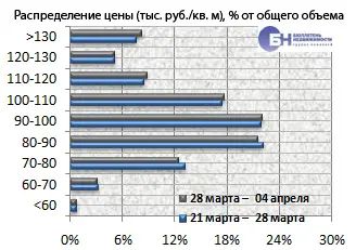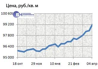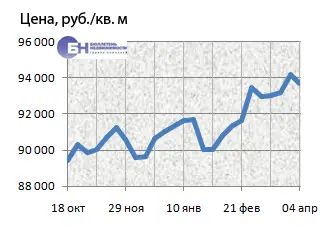 За минувший период изменение средней цены предложения на вторичном рынке квартир в рублевом эквиваленте составило 0,8%, это 741 руб. с квадратного метра. Показатель средней цены предложения за неделю с 28 марта по 04 апреля 2014 года составил 99,2 тыс. руб. за кв. м. Цена предложения в долларах – 2,8 тыс. за кв. м, в евро – 2 тыс.