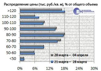 Доля объектов, цена которых меньше 70 тыс. руб. за кв. м, составляет 3,9% от общего объема предложения квартир. Большую долю рынка занимают цены диапазона от 70 до 110 тыс. руб. за кв. м, что составляет 73,8% от объема выставленных на продажу квартир. Диапазон стоимости квадратного метра от 110 до 120 тыс. руб. занимает 8,8%. Доля дорогих объектов, цена которых превышает 120 тыс. руб. за кв. м, – 13,4% от всего предложения.