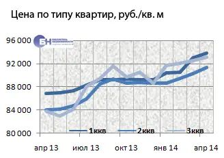 В среднем по рынку строящегося жилья за прошедший месяц процент изменения цены предложения на однокомнатные квартиры составил 0,9%, на двухкомнатные – 1,2%. Трехкомнатные подорожали на 0,6%. Средние цены предложения в апреле 2014 года для однокомнатных квартир – 3,7 млн руб., двухкомнатных – 5,8 млн руб., трехкомнатных – 8,7 млн руб.