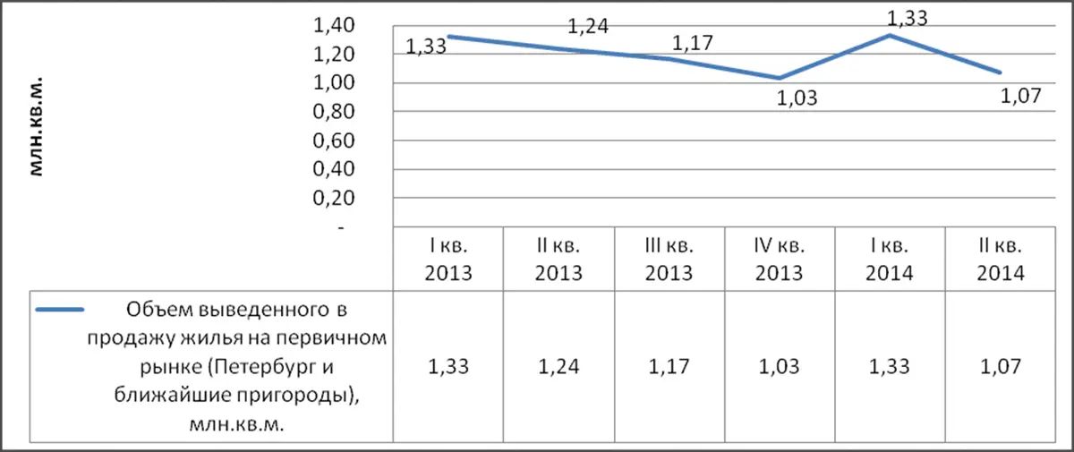 Объем нового предложения на первичном рынке Петербурга, млн.кв.м.