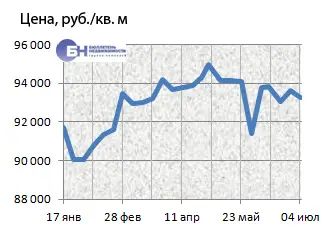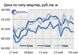 За минувший период изменение средней цены предложения на рынке новостроек в рублевом эквиваленте составило минус 0,4%, это 361,7 руб. с кв. м. Показатель средней цены предложения за неделю с 27 июня по 04 июля 2014 года – 93,3 тыс. руб. за кв. м. Стоимость предложения в долларах – 2,7 тыс. за кв. м, в евро – 2 тыс.
