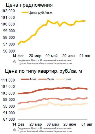 За минувший период средняя цена предложения на вторичном рынке квартир в рублевом эквиваленте практически не изменилась. Показатель средней цены предложения за неделю с 25 июля по 01 августа 2014 года составил 100,5 тыс. руб. за кв. м. Цена предложения в долларах – 2,8 тыс. за кв. м, в евро – 2,1 тыс. за кв. м.