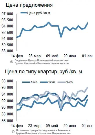 За минувший период изменение средней цены предложения на рынке новостроек в рублевом эквиваленте составило 1,3%, это 1 250,7 руб. с кв. м. Показатель средней цены предложения за неделю с 25 июля по 01 августа 2014 года – 94,8 тыс. руб. за кв. м. Стоимость предложения в долларах – 2,7 тыс. за кв. м, в евро – 2 тыс. за кв. м.