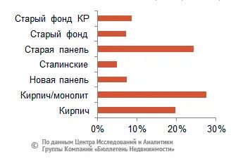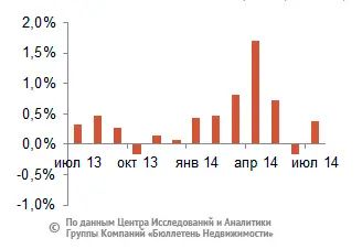 В предложении с разбивкой по типу дома в июле 2014-го, как и в июне 2014-го, преобладают кирпичные и кирпично-монолитные дома, в сумме их доля на конец июля составляет 47,3%. Также наибольший объем в структуре предложения занимают панельные дома старой постройки – 24,3% от всего рынка. Меньший процент приходится на квартиры в сталинских домах.