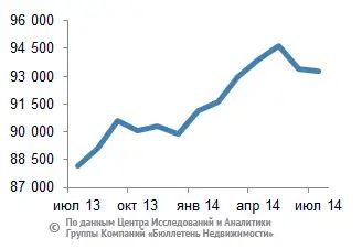 Структура предложения на рынке строящегося жилья по диапазону площадей в июле 2014 года выглядит следующим образом. Максимальное количество предложений однокомнатных квартир, выставленных на продажу, зафиксировано в диапазоне от 35 до 40 кв. м и от 40 до 45 кв. м общей площади, что занимает 28% и 26% от всего объема по указанному типу квартир. В сегменте двухкомнатных квартир максимальное предложение объектов приходится на диапазоны от 50 до 60 кв. м и от 60 до 70 кв. м, что занимает 40,9% и 33,6% от всего объема. По трехкомнатным максимальное число предложений объектов находится в диапазоне общей площади от 75 до 85 кв. м и от 85 до 95 кв. м, что составляет 31,1% и 21,7% от всего объема по данному типу квартир.