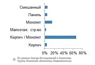В предложении с разбивкой по типу домов по-прежнему преобладают кирпично-монолитные дома, это 66,4% от всего рынка. Меньшая доля предложения в малоэтажных объектах – 2,9% от общего объема новостроек. Доля домов смешанного типа – это, как правило, дома с корпусами, построенными по различным технологиям (кирпично-монолитной и панельной), – составляет 5,8%.