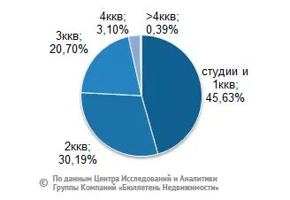 В структуре текущего предложения на рынке новостроек в июле 2014 года, как и в конце июня 2014 года, преобладают студии, одно- и двухкомнатные квартиры, что занимает 75,8% рынка, трехкомнатные – в среднем 20,7%. Многокомнатные (четыре комнаты и более) составляют 3,5% от общего объема квартир в строящихся домах.