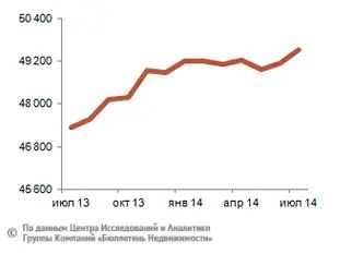 Доля объектов, цена которых меньше 30 тыс. руб. за кв. м, составляет в июле 2014 года 13,6% от общего объема предложения квартир. Большую долю рынка занимает диапазон цены от 30 до 70 тыс. руб. за кв. м, это 75,2% от объема выставленных на продажу квартир. Диапазон стоимости квадратного метра от 70 до 80 тыс. руб. занимает 8,3%. Доля дорогих объектов, цена которых превышает 80 тыс. руб. за кв. м, составляет 2,9% от всего предложения.