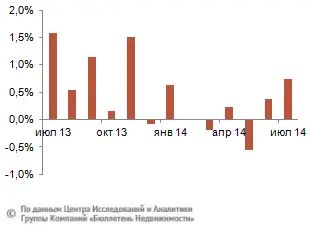 В среднем по вторичному рынку цена предложения на однокомнатные квартиры повысилась за минувший месяц на 0,6%, на двухкомнатные на 0,4%. Трехкомнатные квартиры подорожали на 1,6%. Средние цены предложения на конец июля 2014 года составили на однокомнатные квартиры 1,9 млн руб., на двухкомнатные – 2,3 млн руб., на трехкомнатные – 3,2 млн руб.