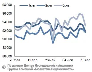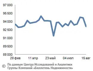 За минувший период изменение средней цены предложения на рынке новостроек в рублевом эквиваленте составило минус 1,7%, это 1 563,7 руб. с кв. м. Показатель средней цены предложения за неделю с 08 августа по 15 августа 2014 года – 93,1 тыс. руб. за кв. м. Стоимость предложения в долларах – 2,6 тыс. за кв. м, в евро – 1,9 тыс. за кв. м.