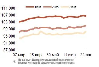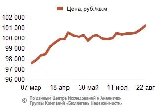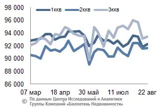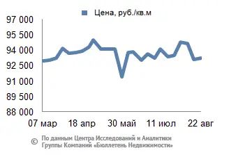 За минувший период изменение средней цены предложения на рынке новостроек в рублевом эквиваленте составило минус 1,7%, это 1 563,7 руб. с кв. м. Показатель средней цены предложения за неделю с 08 августа  по 15 августа 2014 года – 93,1 тыс. руб. за кв. м. Стоимость предложения в долларах – 2,6 тыс. за кв. м, в евро – 1,9 тыс. за кв. м.