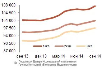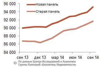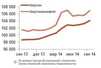 По данным Центра исследований и аналитики Группы компаний «Бюллетень Недвижимости», на последней неделе сентября прошлого года средняя цена предложения на вторичном квартирном рынке Петербурга составляла 96 тыс. руб. за кв. м. С января по май 2014 года наблюдался рост цен, затем до середины лета – передышка (график 1).