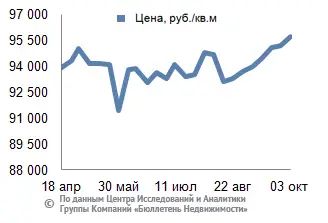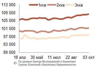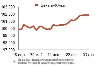 За минувший период изменение средней цены предложения на вторичном рынке квартир в рублевом эквиваленте составило 0,01%, это 7 руб. с кв. м. Показатель средней цены предложения за неделю с 26 сентября по 03 октября 2014 года составил 101,9 тыс. руб. за кв. м. Цена предложения в долларах – 2,6 тыс. за кв. м, в евро – 2 тыс. за кв. м.