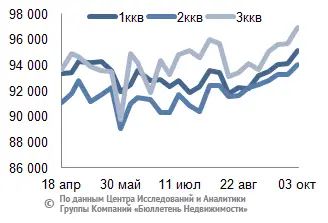 За минувший период изменение средней цены предложения на рынке новостроек в рублевом эквиваленте составило 0,5%, это 495,2 руб. с кв. м. Показатель средней цены предложения за неделю с 26 сентября по 03 октября 2014 года – 95,7 тыс. руб. за кв. м. Стоимость предложения в долларах – 2,4 тыс. за кв. м, в евро – 1,9 тыс. за кв. м.