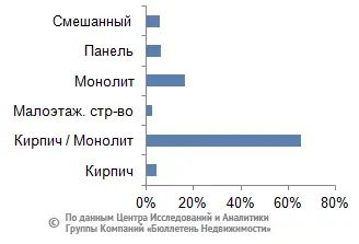 В предложении с разбивкой по типу домов по-прежнему преобладают кирпично-монолитные дома, это 64,8% от всего рынка. Меньшая доля предложения в малоэтажных объектах – 2,8% от общего объема новостроек. Доля домов смешанного типа – это, как правило, дома с корпусами, построенными по различным технологиям (кирпично-монолитной и панельной), – составляет 5,6%.