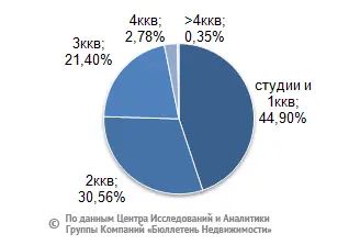 В структуре текущего предложения на рынке новостроек в сентябре 2014 года, как и в конце августа 2014 года, преобладают студии, одно- и двухкомнатные квартиры, что занимает 76% рынка, трехкомнатные – в среднем 20,9%. Многокомнатные (четыре комнаты и более) составляют 3,2% от общего объема квартир в строящихся домах.