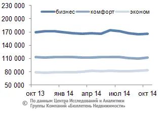 Неудивительно, что средние цены в этих сегментах демонстрируют противоположную динамику. На дефицитный товар – новые квартиры эконом-класса в обжитой части города – они достигли самого большого с 2009 года значения и составили 83,7 тыс. руб. Тогда как в бизнес-классе, где конкуренция значительно выросла, средняя стоимость «квадрата» колеблется от месяца к месяцу, но в целом – заметно снизилась с середины 2013 года: со 178 до 165 тыс. руб.