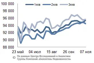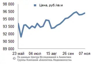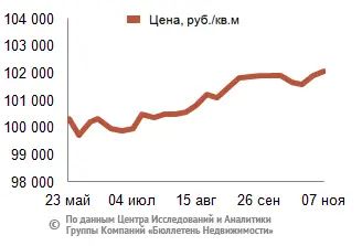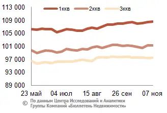 За минувший период изменение средней цены предложения на рынке новостроек в рублевом эквиваленте составило 0,3%, это 303,9 руб. с кв. м. Показатель средней цены предложения за неделю с 31 октября по 07 ноября 2014 года – 96,2 тыс. руб. за кв. м. Стоимость предложения в долларах – 2,1 тыс. за кв. м, в евро – 1,7 тыс. за кв. м.