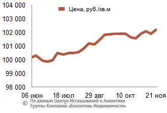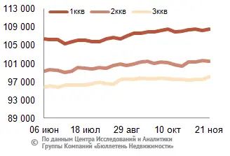 За минувший период изменение средней цены предложения на вторичном рынке квартир в рублевом эквиваленте составило 0,3%, это 266,8 руб. с кв. м. Показатель средней цены предложения за неделю с 14 ноября по 21 ноября 2014 года составил 102,2 тыс. руб. за кв. м. Цена предложения в долларах – 2,2 тыс. за кв. м, в евро – 1,7 тыс. за кв. м.