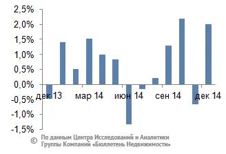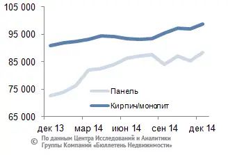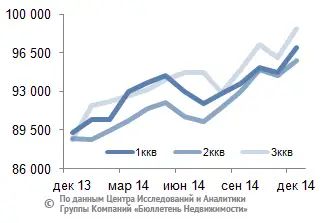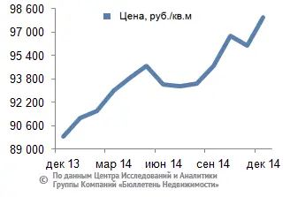 За минувший 2014 год изменение средней цены предложения на рынке строящегося жилья в рублевом эквиваленте составило 9,1%, это 8135,6 руб. с кв. м. Показатель средней цены предложения квартир в новостройках в декабре 2014 года составил 98 тыс. руб. за кв. м.