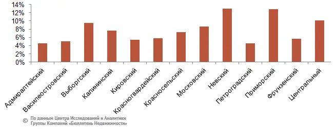 Структура предложения, по данным на декабрь 2014 года, почти не изменилась по сравнению с тем же периодом 2013-го (рис. 3, 4). Основной объем приходится на двух- и трехкомнатные квартиры (соответственно 32 и 31%). Подросла доля предложения квартир в монолитно-кирпичных домах (в настоящее время таковых 28%), а из 13 городских районов более всего предложений приходится на Приморский и Невский (рис. 5).