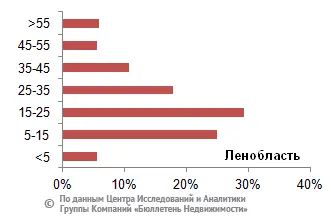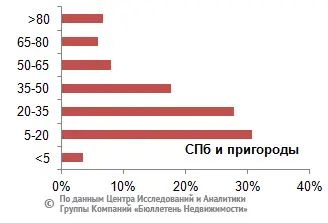 Максимальное количество предложений участков без домостроений Ленинградской области находится в ценовом диапазоне от 50 до 80 тыс. руб. и от 80 до 110 тыс. руб. за сотку, что занимает 23,5% и 20,7% соответственно, а также от 110 до 140 тыс. руб. за сотку, что составляет 15% от всего предложения. На рынке земельных участков Петербурга и пригородных районов максимальный объем предложения приходится на диапазон от 150 до 250 тыс. руб., от 250 до 350 тыс. руб. и от 350 до 450 тыс. руб. за сотку, что составляет соответственно 20,4%, 19,8% и 16,8% от всего предложения.
