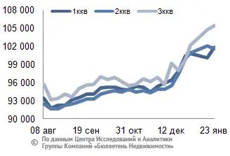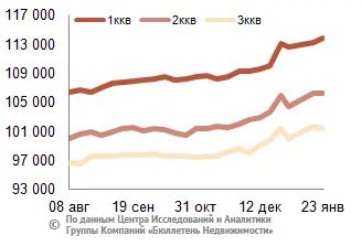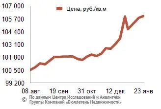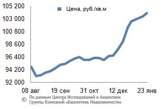 За минувший период изменение средней цены предложения на рынке новостроек в рублевом эквиваленте составило 0,5%, это 562 руб. с кв. м. Показатель средней цены предложения за неделю с 16 января по 23 января 2015 года – 104 тыс. руб. за кв. м. Стоимость предложения в долларах – 1,6 тыс. за кв. м, в евро – 1,4 тыс. за кв. м.