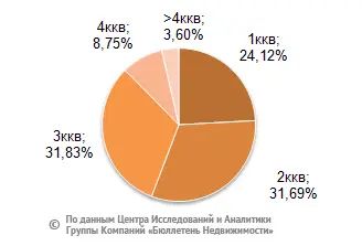 В структуре предложения на вторичном рынке квартир по-прежнему преобладают одно-, двух- и трехкомнатные квартиры, они составили в январе 2015 года 87,6% рынка, многокомнатные – в среднем 12,4% от общего объема.