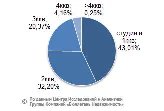 В структуре текущего предложения на рынке новостроек в январе 2015 года, как и в конце декабря 2014 года, преобладают студии, одно- и двухкомнатные квартиры, что занимает 75,2% рынка, трехкомнатные – в среднем 20,4%. Многокомнатные (четыре комнаты и более) составляют 4,4% от общего объема квартир в строящихся домах.