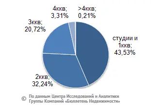 В структуре текущего предложения на рынке новостроек в феврале 2015 года, как и в конце января 2015 года, преобладают студии, одно- и двухкомнатные квартиры, что занимает 75,8% рынка, трехкомнатные – в среднем 20,7%. Многокомнатные (четыре комнаты и более) составляют 3,5% от общего объема квартир в строящихся домах.